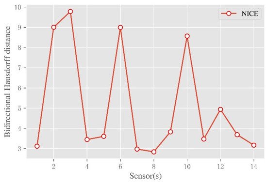 As can be seen from Figure 8, after the missing data are sent to the NICE network and trained, the accuracy of the generated model is measured by the bidirectional Hausdorff distance. Among them, the sensor8 sensor has the highest accuracy and is numerically equal to 2.83, and the sensor4 sensor has lower accuracy and is numerically equal to 9.78. It shows that under different dimension sensors, the bi-directional Hausdorff distance obtained by the proposed method is low and close to the original distribution.
