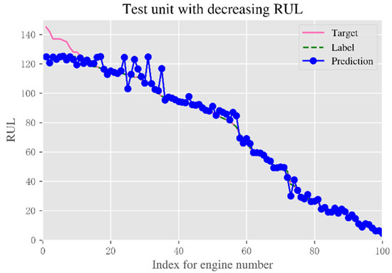 The RUL prediction results for the last recorded data point for the test engine unit in FD001 are shown in Figure 10. Among them, the performance monitoring variables of the engine all change little in the initial stage of degradation, so the extracted features also change slowly in the early stage of degradation. In order to improve the accuracy of the model prediction, we assume that the equipment has no degradation in the early stage of operation, the equipment RUL label is set to piecewise linear, and the maximum value is set to the average life of the engine, 125. Test engine units are sorted by labels from largest to smallest for better viewing and analysis. It can be seen that the RUL value predicted by this method is close to the actual value. Especially in regions with small RUL values, the prognostic accuracy tends to be higher. This is because when the engine unit is operating close to failure, the fault signature is enhanced and can be captured for better prediction.