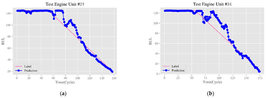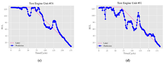 To further observe the prediction results of the method proposed in this paper, Figure 11 shows the full test cycle RUL prediction results of some test engines. Because the performance degradation state of the engine is related to the real-time and effective monitoring data, the more complete the monitoring data, the better the prediction effect. However, in the test dataset, the last part of the sensor measurements is not provided to examine the prognostic performance. Therefore, four engine instances with more test cycles are selected here; the 24th, 34th, 76th, and 81st, and the RUL prediction results of one full test cycle are given.