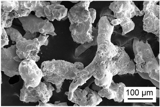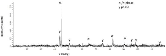 Figure 1 shows the morphology of the 17-4PH steel powder, with irregularly shaped particles with round edges, as well as cavities and hook-shaped protuberances. An X-ray diffraction (XRD) analysis of the powder was performed using a Bruker D8 Advance A25 (Bruker, Billerica, MA, USA) with Cu-Kα radiation at a wavelength of 1.5418 Å and a scanning angle (2θ) in the range of 0° to 120°; the results of this analysis are shown in Figure 2. The X-ray pattern shows that the significant peaks of the phases of the 17-4PH alloy match the theoretical peaks [22], with corresponding peaks of the martensite BCC α/α’ and austenite γ crystalline phases. Austenite is retained and favoured by the presence of nitrogen during atomization [23].