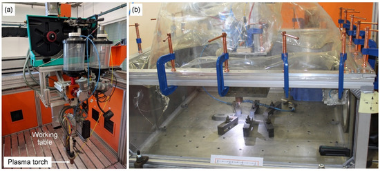 In this research, an AM technique based on PMD technology was employed, whereby the energy source was a generated plasma. The energy was focused on a specific area, with the metallic powder simultaneously injected through a nozzle in the plasma focus; then, a melted zone was formed on the substrate, building the metallic components layer by layer. The aforementioned procedure was completed under two types of atmospheric conditions: in air and under an argon atmosphere with a noble and inert gas, used to protect the formed walls, preventing their oxidation [17,24].