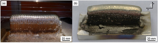 Therefore, two straight walls were produced in air and argon atmospheres, respectively. The first manufactured wall (W1) was built under ambient air conditions, whereas the second wall (W2) was produced in an argon-purged processing chamber. Under an argon atmosphere, the protective atmosphere is assumed to contribute to the reduction in possible oxide formation during the manufacturing procedure [25]; therefore, the performance of the final specimens may vary. The aspect of both walls is revealed in Figure 4. The as-fabricated walls additively manufactured on an AISI 1015 steel substrate have dimensions of 40 mm height, 130 mm length, and 15 mm width.