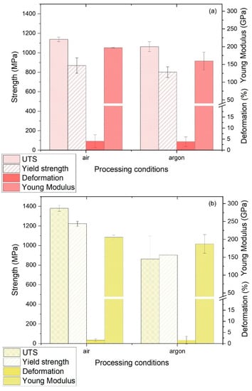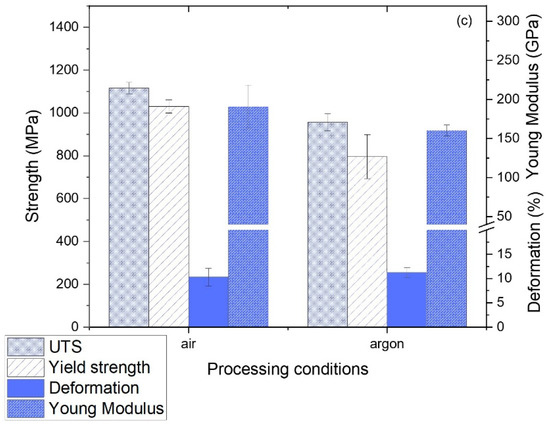 Figure 6a shows a slight but general increase in the mechanical properties for the as-built specimens in air with respect to those manufactured in an argon atmosphere. These data suggest that air as-built specimens fabricated from powder through the PMD process are not only easier and cheaper to manufacture but also have better mechanical properties.
