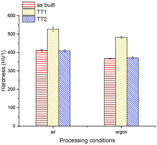 Hardness values of the as-built and TT1- and TT2-treated specimens under both tested atmospheric conditions.