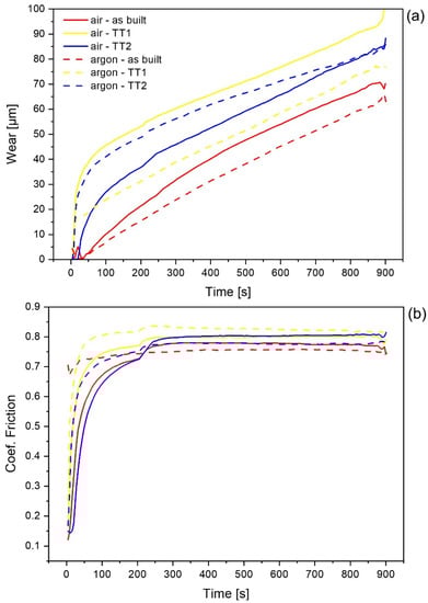 In general, specimens fabricated under argon conditions manifested less surface penetration than specimens built in air, regardless of the thermal treatment applied. Moreover, the specimens treated with TT1 presented a higher friction coefficient than as-built specimens, in agreement with the results of the hardness measurement, for which higher values were associated with TT1-treated specimens. The friction coefficients showed values of approximately 0.75 and 0.85 in specimens TT1 and TT2, respectively; in this regard, the thermal treatment effect was negligible. Furthermore, the obtained experimental results before the plateau show that argon samples, in the time period from the initiation phase until the stabilization point, had a higher friction coefficient than those constructed in air.