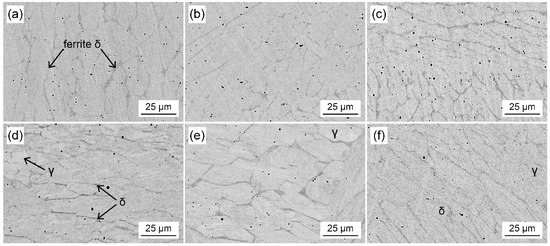 Microstructural comparison of these samples revealed slight variations in the size of the dendrites, in addition to the δ ferrite as the interdendritic phase. As shown in Figure 9b, the microstructure of the specimen built in air conditions after TT1 exhibits a slight decrease in the δ interdendritic phase, whereas the dendritic morphology of the TT1-treated argon-manufactured specimen was caused by a major appearance of a δ interdendritic phase, as shown in the SEM image presented in Figure 9e. Both differences are in concordance with the behaviour presented in the mechanical properties table; the greater the presence of an δ interdendritic phase, the less elongation and therefore the lower the Young’s modulus.