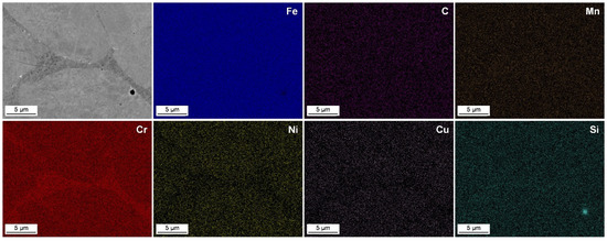 In order to verify and confirm the homogeneous distribution of the elements in the produced 17-4PH specimens, compositional mapping analysis was performed, as shown in Figure 10. In particular, it has been investigated the interdendritic region and analysed the main chemical elements of the alloy. As expected, these were areas chromium-rich, with less nickel and copper than in the martensitic matrix [35].