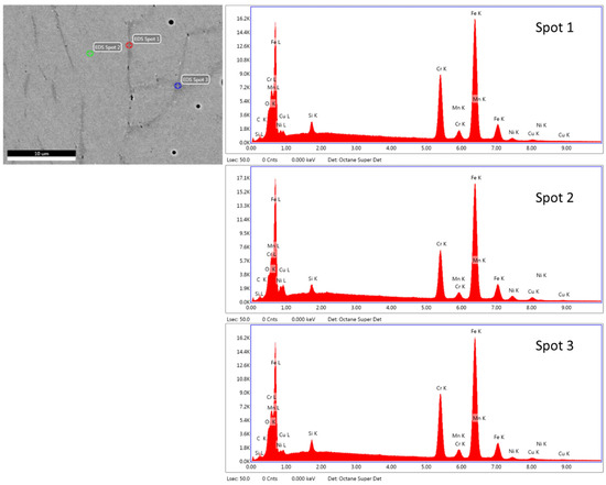 Based on the microstructure observed in Figure 11, three spots were also analysed. Spots 1 and 3 were selected due to their interdendritic location; spot 2 was in the interdendritic phase. The highest chromium content was detected in these interdendritic regions, with EDS analysis indicating a lower nickel content, in agreement with the mapping shown in Figure 10.