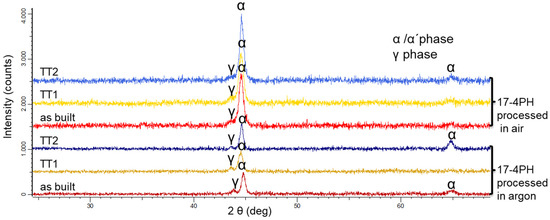 XRD patterns of 17-4PH specimens fabricated via PMD in air and argon analysed as built and after thermal treatment with TT1 and TT2.