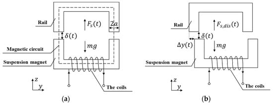 The single suspension magnet model can be regarded as the smallest model unit of the suspension system, and its basic structure is shown in Figure 1, in which, means the width of suspension magnet, represents total mass of suspension magnet and its load, represents the accelerate of gravity, means the suspension gap, means the distance of horizontal misalignment, means the nominal suspension force, and means the suspension force considering the horizontal misalignment.