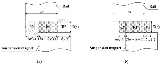 Figure 1b shows the state when the horizontal misalignment exists between the rail and the suspension magnet. When there is a horizontal misalignment, the actual distribution of magnetic induction line in the suspension gap is shown in Figure 2a. The region in the suspension gap can be divided into three parts: R1, R2, and R3.