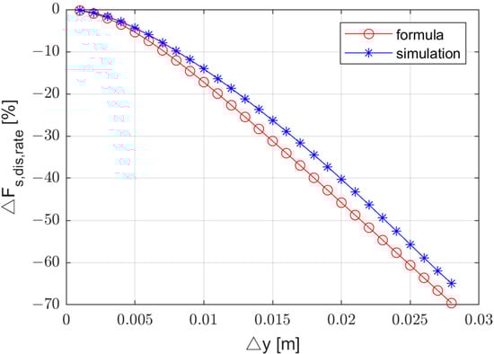 The parameters used in the simulation are substituted into Formula (10), which means 0.028 m, 0.008 m, and [0, 0.028] m. Then Figure 5 can be obtained. It can be seen that, with the increase of horizontal misalignment the amplitude of suspension force decreases. The theory and simulation results are in good agreement.