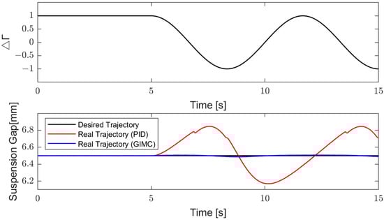 It can be seen that with the control of the PID algorithm, the fluctuation of the actual suspension gap is quite obvious; under the control of GIMC algorithm, the suspension gap is always very close to 0.0065 m, which is hardly affected by the change of .