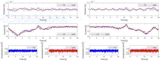 The experimental results are shown in Figure 21. It can be seen that the fluctuation of suspension gap under PID controller is larger than that under GIMC controller, and the variation of suspension current and acceleration are almost the same.