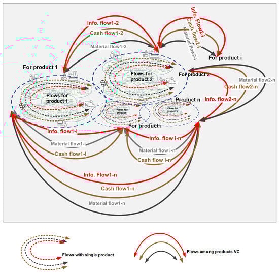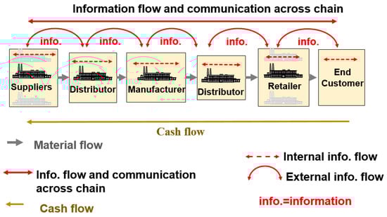 Regarding the mode of business operation, a business value chain (VC) is a supply demand network that may include multiple layers of participants who are linked to the chain by business, and which can add value for their downstream customers by means of business process or activity. The operational activity of participants must aim at adding value to the product/service by each of their focused business processes or activities. In the context of new manufacturing mode-SocialM, the value-adding mode can also be changed with the new manufacturing mode, or extend to a more value-adding opportunity. Figure 1 shows a normal business value chain of an enterprise, with the major business process across the order delivery chain. The enterprise needs to make value-adding to customer orders through the process of the value chain. Regarding the functional process with customer orders, the Association for Supply Chain Management (ASCM) [] points out that the entire supply chain/value chain includes multiple enterprises across the chain, and the associated process is “the integrated process of plan, source, make, deliver, return, and enable spanning from the suppliers’ supplier to the customers’ customer”. According to the above illustration, an entire value chain contains multiple participants: different levels’ suppliers from upstream and different levels’ customers downstream, and we call all of them participants. The participants can be linked by three major flows: materials, information, and cash (see Figure 2), among which the information flow includes internal and external flows. For the single product order delivery process, in the context of the normal VC shown in Figure 2, the material flow is a forward flow that is from the upstream suppliers (higher layer participants) moving to the downstream participant (except product returns). The cash flow is a reverse flow from downstream to upstream. The information flow should be both ways in the chain as the involved participants should communicate or share necessary information. The management of the value chain is mainly associated with the three flows.