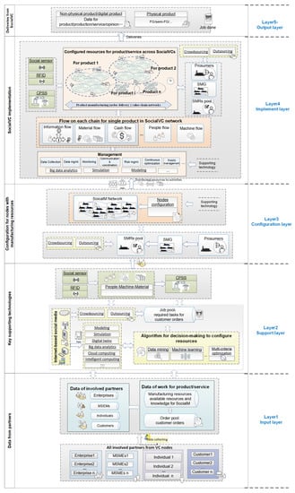 Regarding SocialVC system, it is associated with SocialM, the concept of value chain and the value-adding across chain, and some important supporting technologies mentioned in the previous sections. To establish the SocialVC system, this research proposes an architecture of the SocialVC system (See Figure 4). As Figure 4 shows, the architecture is layered and interconnected among each. The information and data through chain participants should be collected and shared by Internet-based social media platform, and the available manufacturing resources is identified. The required tasks for customer orders are distributed by means of supporting technologies. Meanwhile, SMRs are defined and matched to the SocialVC network. Finally, the ordered product/service and tasks are completed, and delivered by means of distributed SMRs/SMGs/prosumers. According to the above logic, the proposed architecture system is divided to five layers that are associated with the value-adding through the customer order delivery process in the context of the SocialVC system. The details of each layer are illustrated in the following subsections.