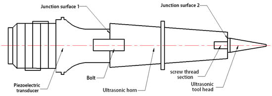 The assembly junction surfaces in the acoustic vibration component contact the component through a certain preload force. When the ultrasonic wave passes through the junction surface, the junction surface is affected by the stress generated by the ultrasonic wave and its preload force, and local changes will occur, such as separation, slippage, adhesion, and other phenomena [15]. The piezoelectric transducer is mainly composed of front and rear covers and multiple groups of piezoelectric sheets, which are connected by preloading bolts. There are multiple groups of junction surfaces in the piezoelectric transducer. In addition, the assembly of the piezoelectric transducer and the ultrasonic horn, as well as the assembly of the ultrasonic horn and the tool, have corresponding junction surfaces. The transducer was a fixed component connected to the ultrasonic horn. Because the influence of assembly factors on the performance parameters was studied in this paper, the internal junction surface of the piezoelectric transducer was not analyzed. The junction surface 1 of the piezoelectric transducer and the ultrasonic horn were connected by screws, and the junction surface 2 of the ultrasonic horn and the tool were connected by their own threaded section, as is shown in Figure 1.