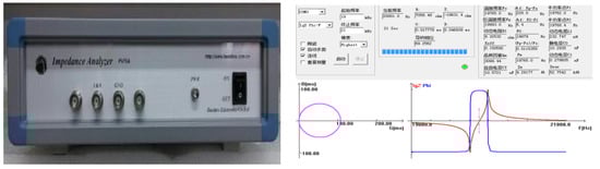 The static performance parameters were measured by an ultrasonic impedance analyzer. The PV70A ultrasonic impedance analyzer of Beijing Confederation Times Electronic Technology Co., Ltd. was used in this test, as shown in Figure 3. Through the test of acoustic vibration components, key static performance parameters such as resonant frequency and dynamic resistance of acoustic vibration components could be obtained. These were the key factors in estimating the reliability of acoustic vibration components and whether they could match well with matching circuits.