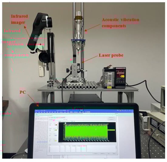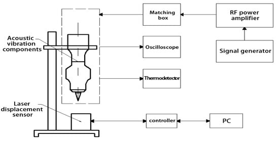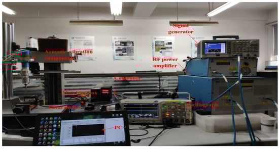 The dynamic performance experiment set of acoustic vibration components is shown in Figure 5 and is mainly composed of test modules for frequency drift, amplitude, power, and temperature. The frequency drift test module made the acoustic vibration components reach the best state by adjusting the signal frequency generated by the signal generator (AFG3022C, Tektronix, Beaverton, OR, USA) and collected the frequency value of the signal generator, and obtained the frequency drift. The amplitude test module controlled the laser displacement sensor (LK-G5000, KEYENC, Osaka, Japan) through a PC to measure the amplitude. The power test module used the voltage probe and current probe of the oscilloscope (MDO3014, Tektronix, Beaverton, OR, USA) to collect the voltage, current, phase angle, and other signals of the acoustic vibration component in real time to measure the ultrasonic power. The temperature of the transducer was the highest temperature in the component when the acoustic vibration component was working. The infrared imager (E50, FLIR, Portland, OR, USA) was used to measure the temperature of the transducer.