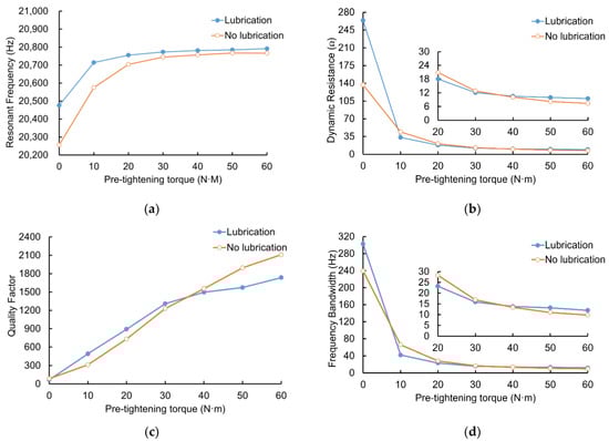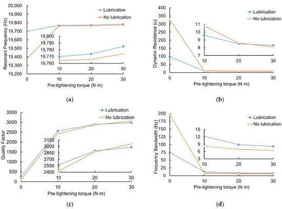 It can be seen from Figure 8c that the quality factor changes obviously within the range of 0–10 N·m of the preload torque, rising from a few hundred to about 2500, then slowing down and gradually becoming stable after 20 N·m;