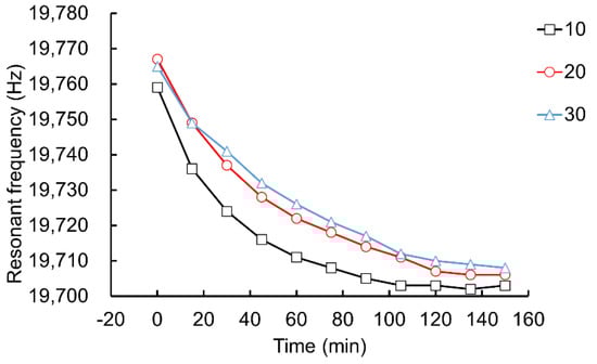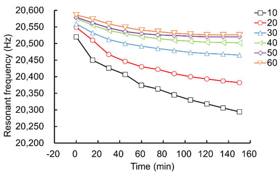 During the running time of 0–150 min, the resonance frequency of the ultrasonic horn under different assembly preload torques was measured using the dynamic performance parameter measurement system. According to the experimental data, the influence of the preload torque at the junction surface of the ultrasonic horn between 10–60 N·m on the resonant frequency of the acoustic vibration component (without tool head) was drawn, as shown in Figure 9.