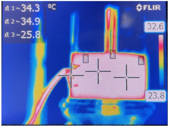 During the running time of 0–150 min, the infrared imager was used to measure the temperature of the acoustic vibration component with different assembly preload torques on the junction surface of the ultrasonic horn. The infrared temperature measurement experimental device is shown in Figure 10. The temperature distribution of the transducer is shown in Figure 11.