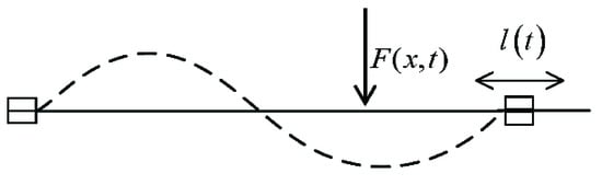 The BC and other active control methods need the reliable control strategies. In the case of unknown disturbance, the control performance depends on the disturbance observer. The BC methods are popular because the boundary conditions can affect the vibration characteristics of strings. Changing the position of damper on the string can affect the vibration suppression performance [4]. Changing the string length can cause the variable of amplitude and natural frequency [17,18]. The variable length strings have always been the controlled object, but the variable length can also be used as a strategy to suppress the resonance of string. The frequency variation of a variable length string can destroy the stable resonance. However, there is few research about the perspective according to authors’ survey. Therefore, a time-varying string length method is proposed to suppression resonance in this paper. The resonant frequency is continuously changed by the time-varying fixed position of end. The mode shape changes before the response stabilizes.