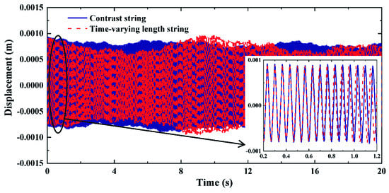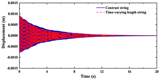 When the damping coefficient is c = 0.0005, the time-domain free vibration comparisons are shown in Figure 5, and the frequency-domain comparisons are shown in Figure 6. The coefficient ranges of the last terms in Equation (6) become −0.08 to 0.08. The coefficient of the last terms can still be regarded as small quantities. Figure 5 gives the vibration attenuation of two strings due to damping. The peak attenuations of time-varying length string in Figure 6 are lower than those in Figure 4, because the effect of the damping on the contrast string is greater than that on the time-varying length string. Moreover, the damping reduces the responses of time-varying strings in other frequency bands.