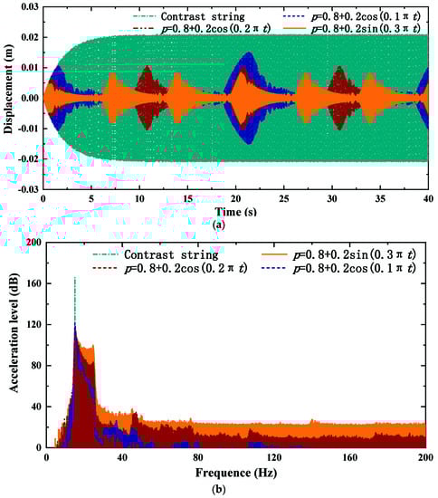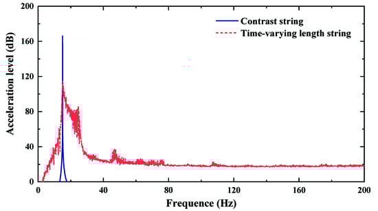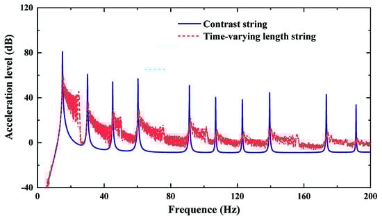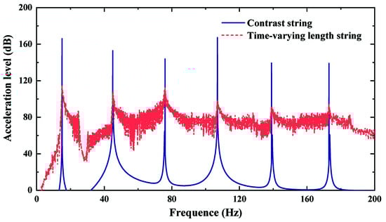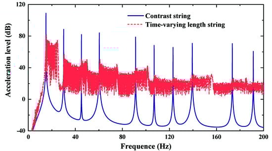 Figure 3 shows the time-domain free vibration comparison of time-varying length string and contrast string without damping. Figure 4 gives the frequency-domain comparison of acceleration level. In Figure 3, the vibration frequency and amplitude of time-varying length string is different from that of contrast string. The vibration frequency varies with the string length. In Figure 4, there are multiple vibration peaks at the natural frequencies of contrast string, while the peaks disappear in the spectrum of time-varying length string. In addition, the response of time-varying length string is larger than that of contrast string in other frequency bands. This is because the change of vibration frequency leads to peak energy dispersion.