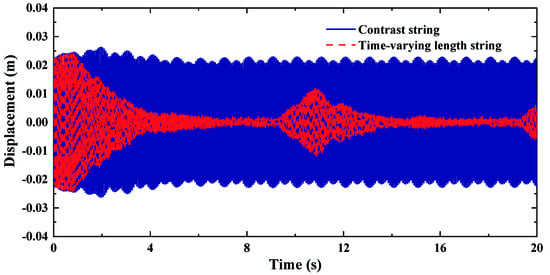 To verify whether the time-varying string length method is effective when the multiple order resonance occurs, the structures need the multiple frequencies excitation. The frequencies are the first six resonance frequencies of contrast string. The time-domain and frequency-domain comparisons of the time-varying length string and contrast string are shown in Figure 9 and Figure 10. In Figure 9, the amplitude of time-varying length string is always lower than that of the contrast string in the process of periodic variations. The time-varying string length method can disperse every resonance peak energy at the same time.