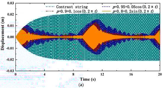 In this section, the influences of the time-varying frequency and time-varying range on the vibration suppression performances are studied. The resonant frequency varies with the string length. Therefore, the time-varying range and time-varying frequency of string length can affect the variation characteristics of steady-state amplitude and frequency. The vibration comparison with different time-varying frequencies (0.05 Hz, 0.1 Hz, 0.15 Hz), is shown in Figure 11. The spectrums are converted from 20 s–40 s time-domain results. The maximum coefficient ranges of the last four terms in Equation (6) for these cases are −0.29 to 0.18, 0 to 0.06, −0.24 to 0.24 and −0.24 to 0.24. The coefficients of the last four terms are obviously less than 1. The vibration comparison with different time-varying ranges (0.1 m, 0.2 m, 0.4 m) is shown in Figure 12. Figure 12b gives the spectrums converted from 10 s–20 s time-domain results. In Figure 11, the length time-varying frequency can affect the vibration period and maximum amplitude. The effect of the time-varying frequency on the peak attenuation is slight. The larger time-varying frequency leads to a greater peak energy dispersion performance. Because the greater speed of change leads to the shorter time of resonance frequency stays near the excitation frequency. In Figure 12, the amplitude decreases as the time-varying range increases. The peak energy dispersion performance is greater in the larger time-varying range.