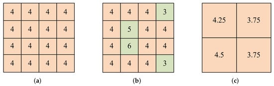 The light environment of the pigeon farm is complicated, the ambient light is dark, and the shutter speed and aperture value set by the camera are high, which leads to a lot of noise in the image. These noises will not only affect the image quality but also greatly increase the image’s file size for pictures with the JPG compression format, which will result in the inability to train with a large Bach-size and affect the effect of subsequent model training and detection. Therefore, the average sampling method is adopted to downsample the training set, as shown in Figure 1.