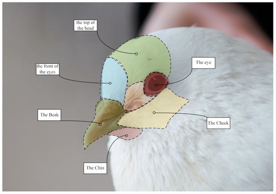 In this paper, the eye-beak compound area is labeled, and the features are extracted in this area. As shown in Figure 4, one side of the annotation box is tangent to the edge of the beak, and the other side is tangent to the eye, thus limiting the detection network to only extract features from the inside of this area. As a control, the entire head of the pigeon is labeled.