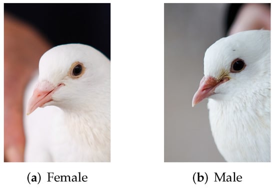 Among the existing birds, about 50% of them are monomorphic [3]. They do not have obvious external genitalia, and they cannot distinguish the individual sex of the same species from appearance. The pigeon is one of them, so it is difficult to accurately identify the individual sex via simple morphological examination. For the sex identification of monomorphic birds, it is common to dissect and observe their internal reproductive organs or to use chromosome and DNA molecular identification methods to observe cultured somatic cells with a microscope to see if there is a specific W chromosome to identify the sex. However, the number of birds’ chromosomes is large, and the distribution is chaotic, so it is easy to make classification errors by manually dividing their morphology [4]. Molecular identification methods have been applied to the sex classification of birds. Clinton, M and others have designed a chicken embryo sex identification scheme based on PCR, which uses tissue sample cells to complete the sex identification of chicken embryos and can identify the sex of chicken embryos at the early stage of development [5]. Romanov et al. carried out the sex detection of 84 bird species using molecular measurements [6].