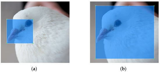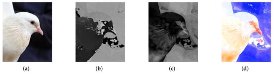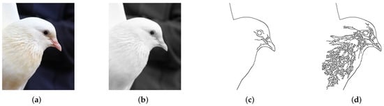 There is no uniform texture orientation with respect to the pigeon’s head feathers. In this paper, the Canny algorithm is selected as the edge search algorithm, which keeps the contour information in all directions. At the same time, in order to keep as much edge information as possible for detection and recognition, the image will not be blurred before edge detection. As shown in Figure 6, compared with the image with Gaussian blur, the image without blur can detect more contours and keep the complete contour information of pigeon’s head.