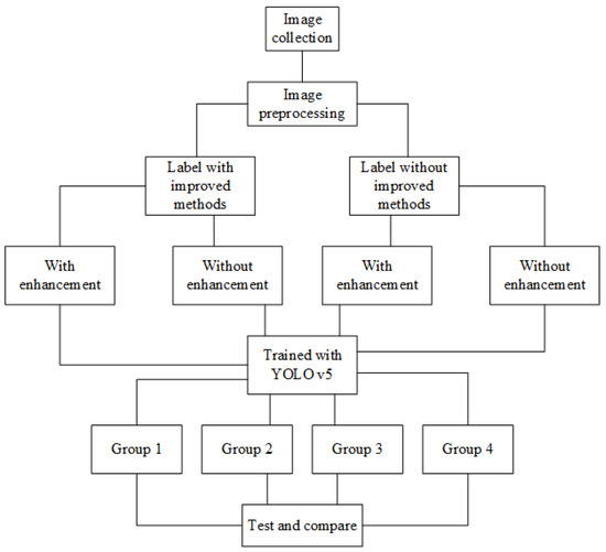 In this paper, the YOLO v5 framework is used to train the enhanced image, and the smallest Yolo V5 model is selected as the detection network. The test set and the verification set are copied into four groups, and each group is treated as follows: The first group does not have any enhancements, the second group is only enhanced with features (weight and weight ), the third group only uses the improved labeling method, and the fourth group is enhanced with the improved labeling method and features (weight and weight ). After training, the test sets are used for testing and data analysis. The overall test flow chart is shown in Figure 9.