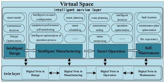 The intelligent service layer provides intelligent services for each stage of the physical space on the basis of the real-time data from the twin layer and the physical space, realizing intelligent design, intelligent manufacturing, smart operation, and self-maintenance of the ship. For example, in the ship maintenance stage, based on the ship maintenance DTM, historical maintenance data, ship equipment attributes and real-time data, the predictive maintenance and life prediction of the ship are realized.