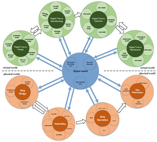 In recent years, the digital twin has been widely used in shop floor manufacturing, aerospace, medical, urban construction, ships, automobiles, and other fields [8], but there is less research on digital twin for the ship whole life cycle (SWLC). In the ship manufacturing stage, Wu [25] used digital twin technology to achieve the intelligent manufacturing of ships and validated it with a pipe-processing line; Li [26] adopted digital twin technology to realize the prediction and control of ship group product quality. In the ship maintenance stage, VanDerHorn and Anyfantis [27,28] proposed a digital-twin-based method for predicting the structural state and life of a ship to support the maintenance plan and operational decision of the ship. Giering and Yang [1,29] proposed the research idea of a digital twin of SWLC but did not consider the connection among the various stages of the life cycle and the impact of historical data on each stage. In comparison with the existing research, the main contributions of this paper are as follows: