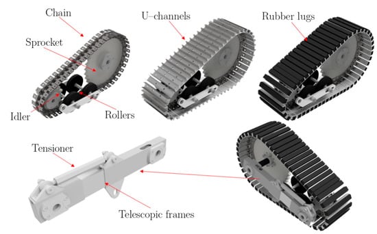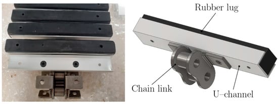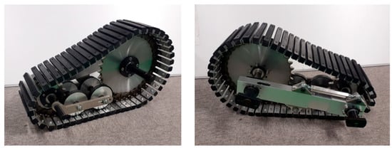 The track module shown in Figure 3 was designed, realized, and tested at the Ishii Laboratory of the Kyushu Institute of Technology [14]. A roller chain track was chosen among the various possible mechanical solutions to build a custom track. The belt consists of an attachment chain (also known as a conveyor chain) with built-in flanges on which treads can be easily attached to form a track.