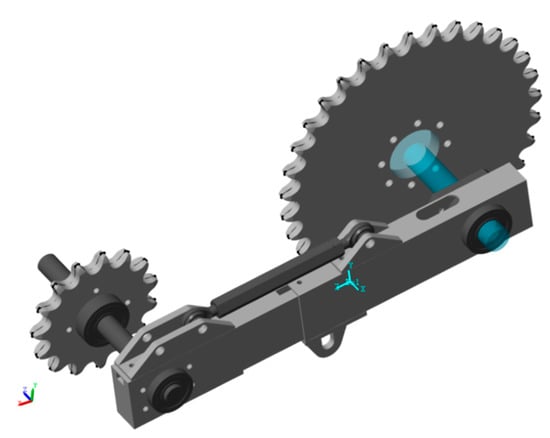 The alternation of the internal links (bushing links) and external links (pin links) shown in Figure 11a forms the roller chain track of the robot. It is evident that to simulate the switching phases, it is necessary to model the contact between the chain bushing/rollers and the teeth of both the sprocket and the idler [19,20,21]. First, an assumption was made about the motion of the links, i.e., that they are constrained through a planar joint to perform a planar motion on the plane of the two gears so that the model accounts for the contact between the bushing cylinder (shown in red in Figure 11) and the surface of the sprocket teeth, whereas any side contact is excluded. A reference frame is attached to the sprocket as follows: