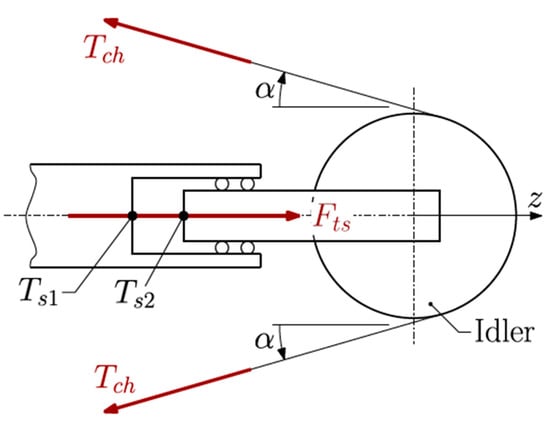 where α is the chain angle shown in Figure 9. In light of such implementation, it is possible to simulate the model with differing values of chain tension, which are usually expressed as fractions of the vehicle weight [1].