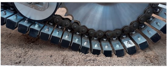 The track belt comprises a chain with attachments (see Figure 10). Although the chain is composed of articulated links forming a closed kinematic loop, the belt can be modeled by connecting all the links to form a unique rigid body made up of the chain, the sprocket, the idler, the undercarriage, and the track frame. Such a modeling strategy, although simple and fast, does not capture the flexibility of the track belt, thus leading to an unrealistic, almost uniform pressure distribution over the ground contact area, which is equivalent to assuming a rigid footing, as is often the case in the literature on rolling resistance evaluation. To fulfill the goal of assessing how the pressure originated by the track–terrain interaction distributes over the contact patch, it was necessary to model the chain more accurately.