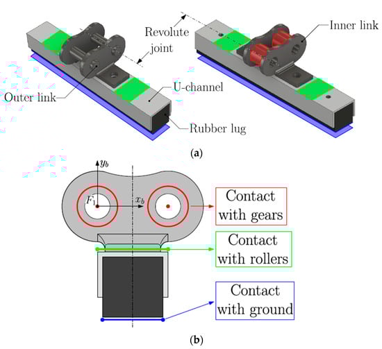 The chain shows the alternation of external links (26 pin links such as that on the left in Figure 11a) and internal links (26 bushing links such as that on the right in Figure 11a). Each link is connected to the two adjacent links using revolute joints to permit relative rotations, as shown in Figure 11a. The total of 52 links are divided into 13 groups of 4. Figure 11a,b indicate the contact surfaces, highlighted in different colors: