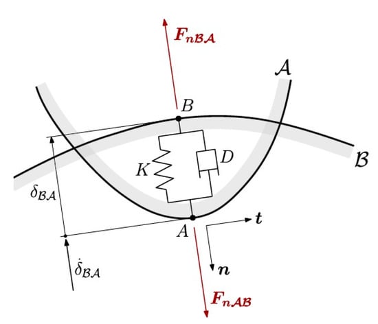The contact force can be decomposed into the normal and tangential components, which act along unit vectors n and t. The normal contact force that A exerts on B (FnAB) shown in Figure 12 is computed as if it were generated by a linear spring–damper system placed between points A and B so that [18]