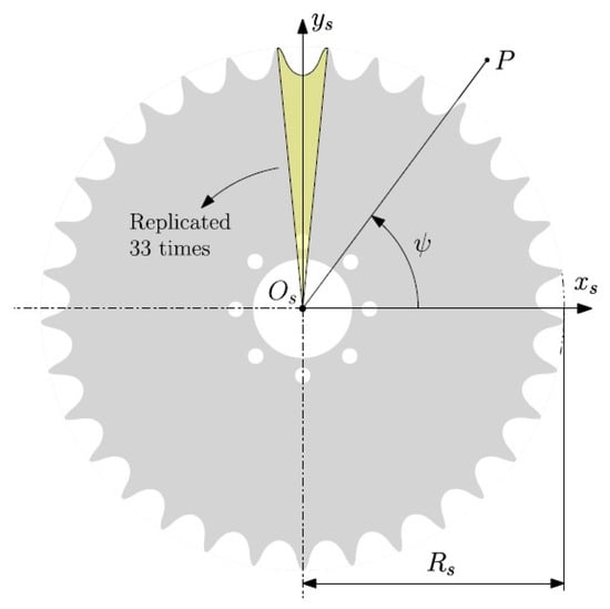 - The positions of the profile points of the k∗th tooth with respect to the bushing center (F1) are computed as (12)where xsi,k∗ and ysi,k∗ are the x and y coordinate, respectively, of the point (Pi,k∗) expressed in the sprocket reference system (Os; xs, ys).