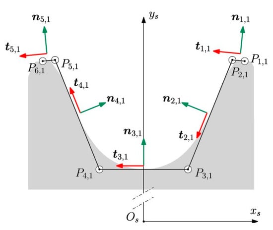 In the present analysis, to simplify the model and reduce the computation time, for each tooth of the sprocket, six points were selected relative to the sprocket center in such a way as to construct an approximated piecewise linear tooth profile sufficiently close to the real profile, as shown in Figure 14. The coordinates (xsi,1, ysi,1) expressed in the reference system (Os; xs, ys) of the point Pi,1 i = 1, …, 6 used to approximate the first tooth are summarized in Table 1. The six points identify five lines that represent as many surfaces of possible contact; the nth of these lines, with n = 1, …, 5, has a tangent unit vector given by (7).