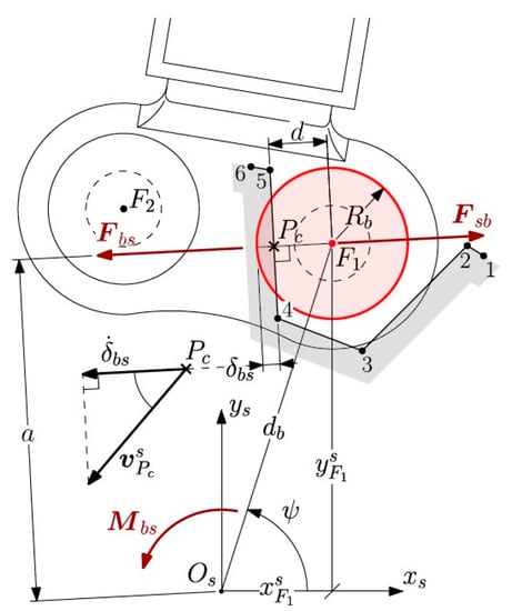 - The sprocket tooth with which the considered bushing is likely to collide is identified based on the angle (ψ) between the vector from Os to F1 and the xs axis of the sprocket reference frame, i.e., (11)