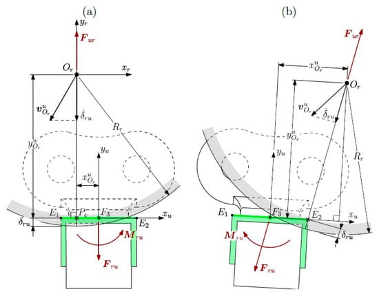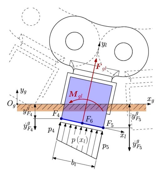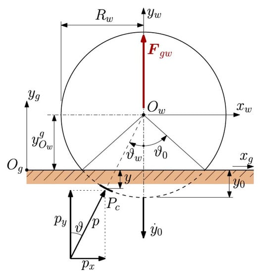 - The force exerted by the ground on the wheel (Fgw) is determined by taking the integral of the pressure distribution (45) over the contact area, as in (48),where yw is the unit vector of the yw axis of the reference frame attached to the wheel. In deriving the force (48), the pressure (p) is assumed to be uniform along the direction of the zw axis, i.e., normal to the plane of the diagram in Figure 18. The integral in (48) is solved numerically at each simulation time step. The force (Fgw) is then applied to the wheel. Because the shear stress at the wheel–terrain interface is supposed to be null, and the pressure (45) is symmetrical with respect to the wheel centerline, no torque contribution is included in this case.