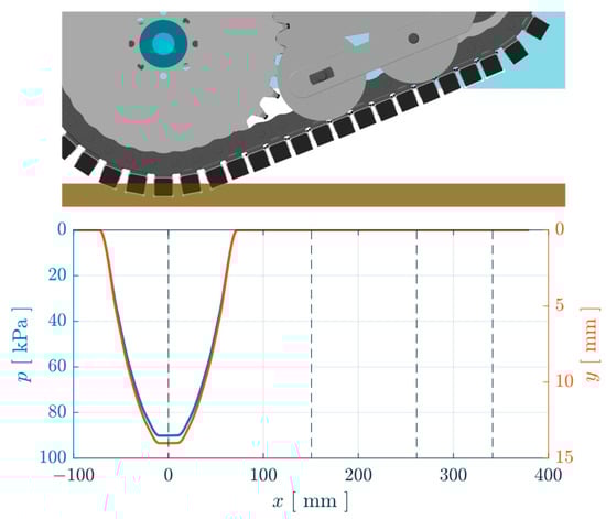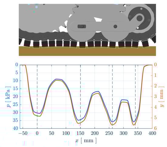 In contrast, the sinkage of the track in contact with the terrain only is determined by the roadwheel spacing and the chain tension, as well as the assumed pressure–sinkage relationship. The observed sinkage profile resembles the normal pressure graphed in Figure 21; as expected, the distribution is far from uniform, as it presents with peaks under the sprocket, the two rows of rollers, and the idler. The lowest pressure value occurs where the spacing is greatest, i.e., in the section between the sprocket and the first row of rollers.