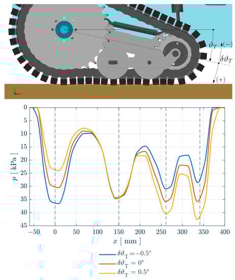 Observation of the three curves mentioned above indicates the significance of the effect of the control deviation (δϑT) on the pressure distribution. According to Equation (53), the higher δϑT is, the harder the control system forces the actuator to push the track frame against the ground; as a consequence, the peak of pressure beneath the idler (and partly that beneath the second row of rollers) increases at the expense of that under the sprocket. This is easily understood by considering that as δϑT increases from −0.5° to 0.5°, as shown in Figure 21 (from the blue curve to the yellow curve), the actuator drives the rocker slightly further and causes the shock absorber to exert an increased compressing action on the track frame.